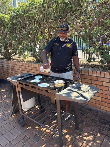 Pastor Fil cooking pancakes in the Church courtyard on Shrove Tuesday.